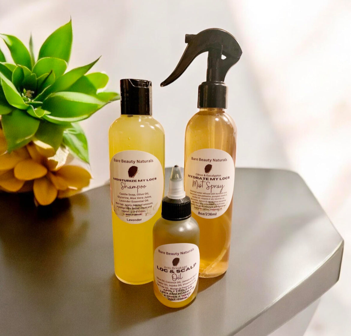 Our LOC MOISTURE BUNDLE is perfect for keeping healthy loc care routine. With our moisturizing shampoo, hydrating loc spray and anti breakage loc oil this is perfect for you.