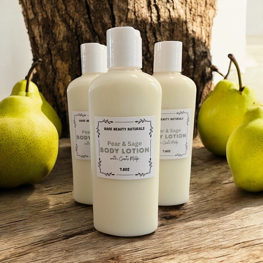Our pear & sage body lotion is a great skin moisturizer helps to hydrate and nourishes your skin made with goats milk powder to balance out the smoothness and less greasiness. We use all natural ingredients of distilled water, goats milk, olive oil, castor oil, jojoba oil, vitamin E oil, tea tree oil, btms 50, stearic acid, emulsifiying wax, pear & sage essential oils. Optiohen (preservative). Each bottle is 7.8 is . Best to use after shower/bath. Shea butter & mango butter are included.