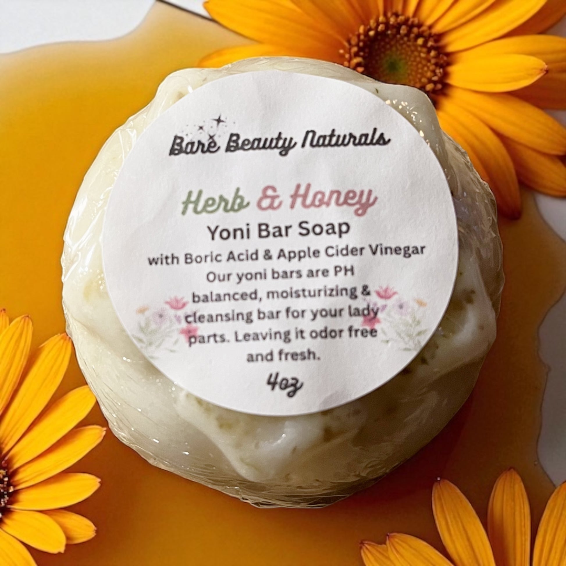 Hey ladies, need a great moisturizing lady soap to help balance your ph, eliminate odor, and to prevent personal situations. This is the soap for you. Our herb & honey yoni bar will have you feeling fresh. Great lather and a light floral scent. It is made with our moisturizing glycerin soap base, calendula & chamomile herbs infused in olive oil, coconut oil, tea tree oil, neem oil, castor oil, . Also, has boric acid, apple cider vinegar, honey, mint herbs, rosemary & rose essential oils. The bars are 4-1oz . Please always do a skin patch test to make sure it’s good use for you.